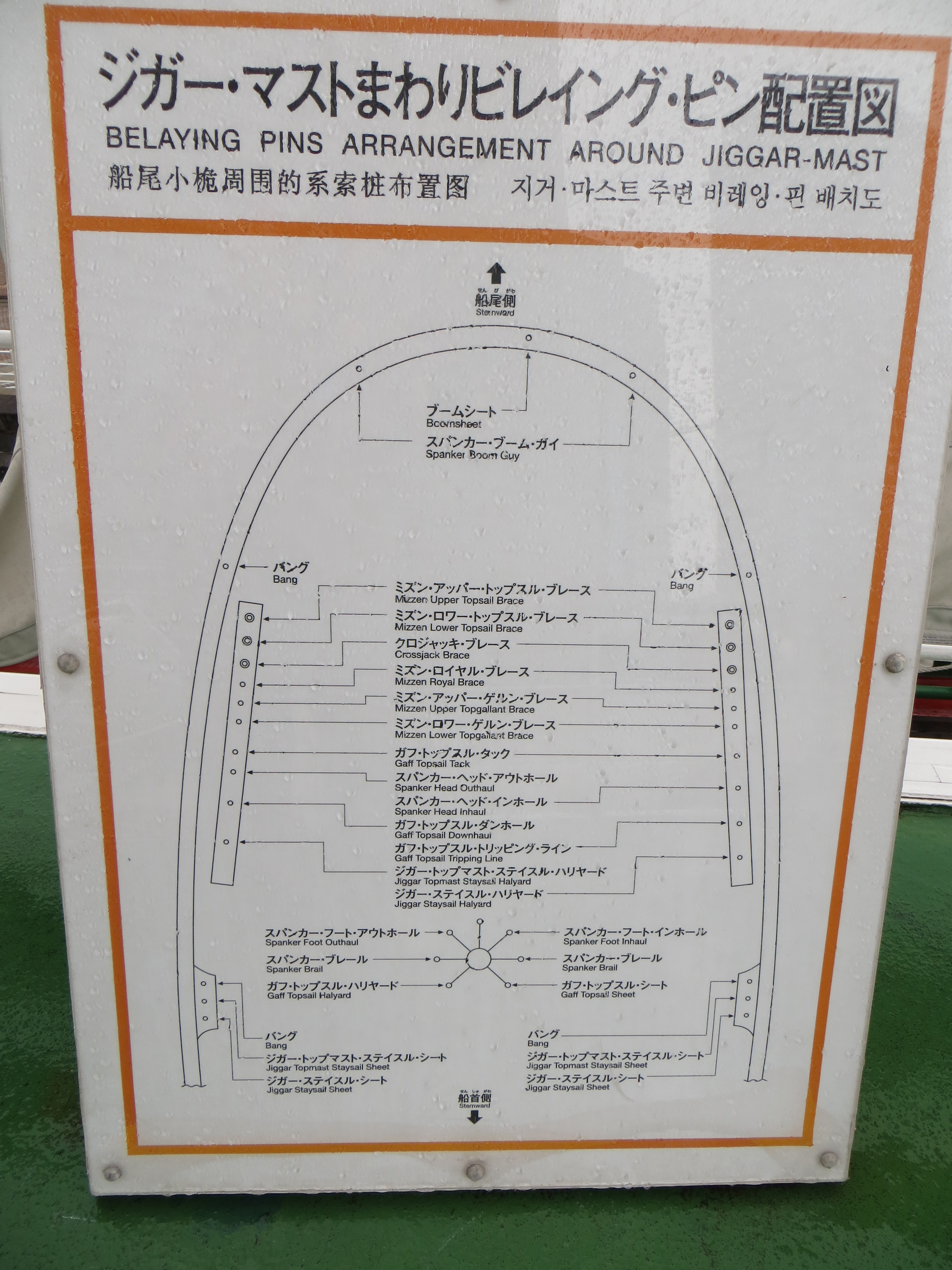 These terms were no doubt in use long before Japanese sailors became familiar with European-style sailing ships (before Date Masamune had his first Spanish galleon built in 1613). The same goes for terms like 帆柱 ho-bashira ‘sail-pillar = mast’ and 帆桁 ho-geta ‘sail-beam = yard(arm)’. Nevertheless, the Japanese text begins with the katakana synonym for ‘yard’ (yaado) followed by its kanji equivalent (帆桁) in parentheses, and employs exclusively katakana terms (borrowed from English) for ‘sail’ (seiru), ‘rope’ (roopu), and ‘mast’ (masuto). Why? Because the names for all the subcategories of nautical masts, sails, and rigging have been imported wholesale from English. At eye-level on each of the four masts is its name in katakana: foamasuto ‘foremast’, meinmasuto ‘mainmast’, mizunmasuto ‘mizzenmast’, and jigaamasuto ‘jiggermast’ (and ‘bowsprit’ is bausupritto). There are ways to write ‘front mast’ and ‘back mast’ in kanji, but it is much harder to differentiate four masts using traditional (Sino-Japanese) terminology.