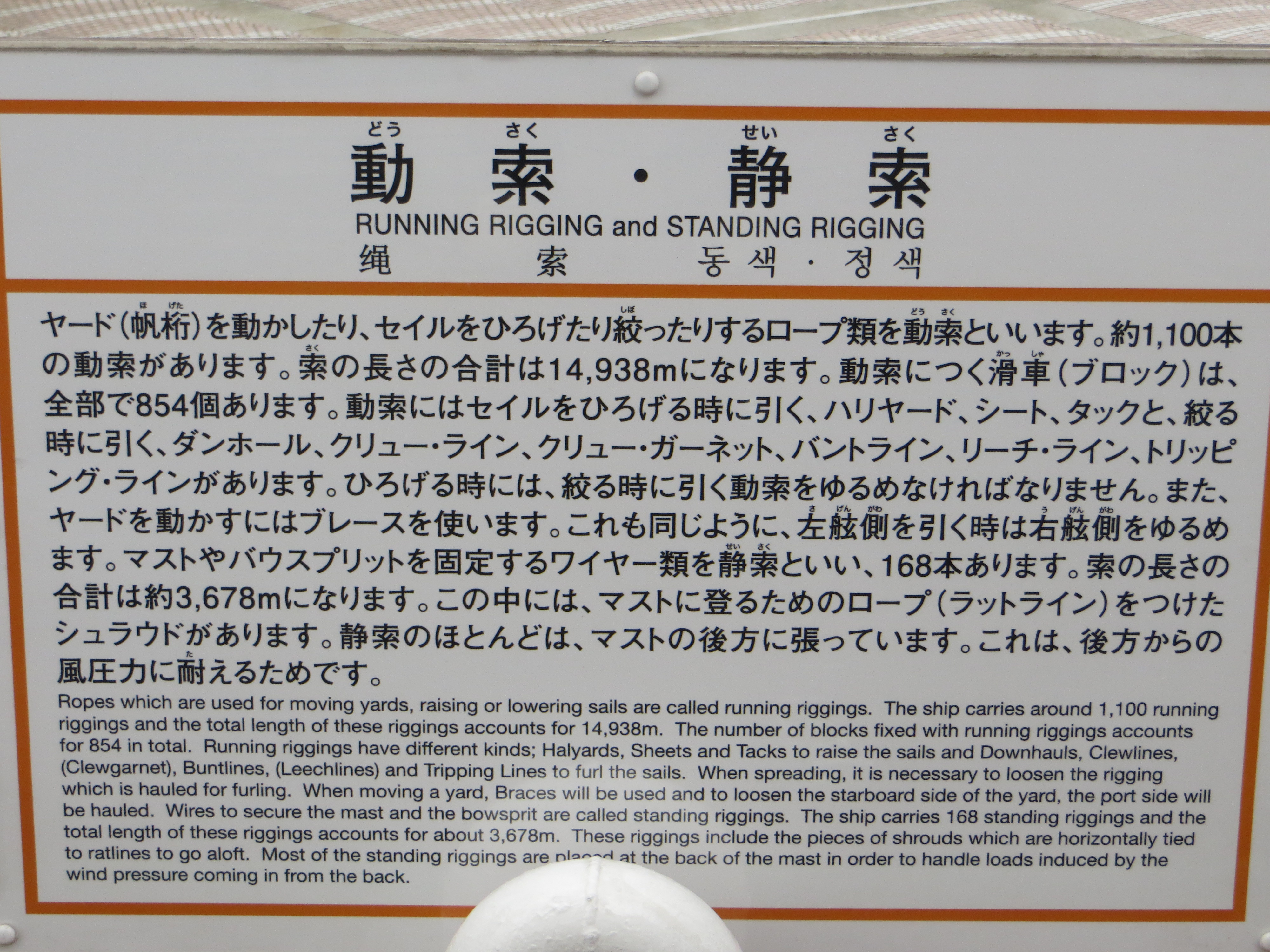 Here’s the text of the English translation on an explanatory sign about the rigging on the Nippon Maru. Though phrased rather awkwardly, it is very clear and instructive.